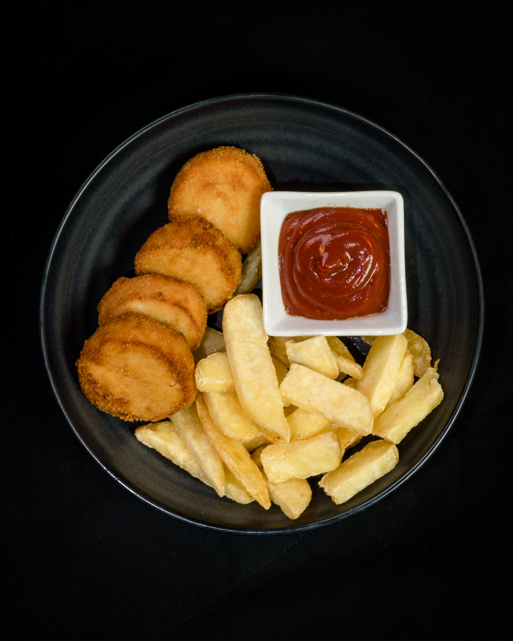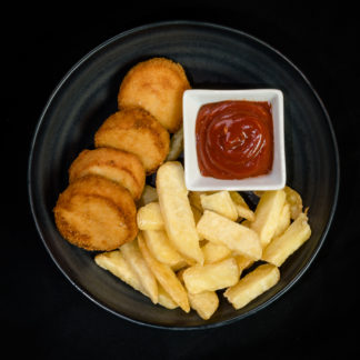 Servert med fries. Allergener: gluten av hvete, egg.