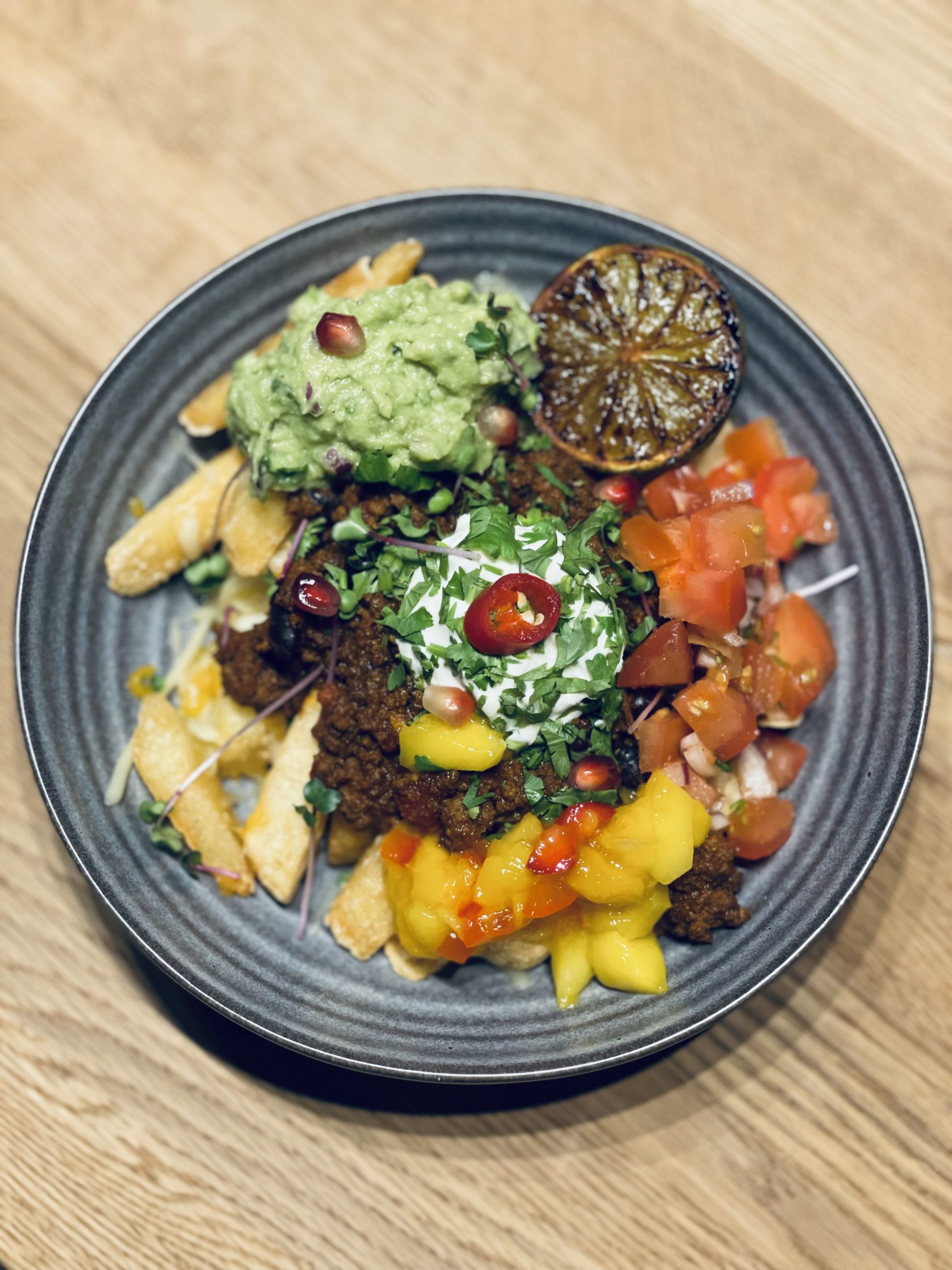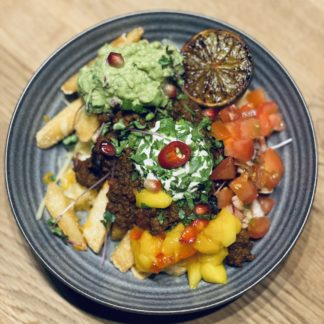 Pommes frites servert med chili con carne, ost, mangosalsa, tomatsalsa, guacamole og hvitløksaus. Allergener: soya, sesamfrø, laktose.