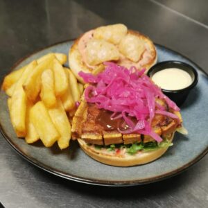 Sandwich med juleribbe, lettsyltet rødkål, julesaus og tyttebærmajones. Serveres med pommes frites og hvitløksdressing. Allergener: melk, gluten av hvete, sennep.